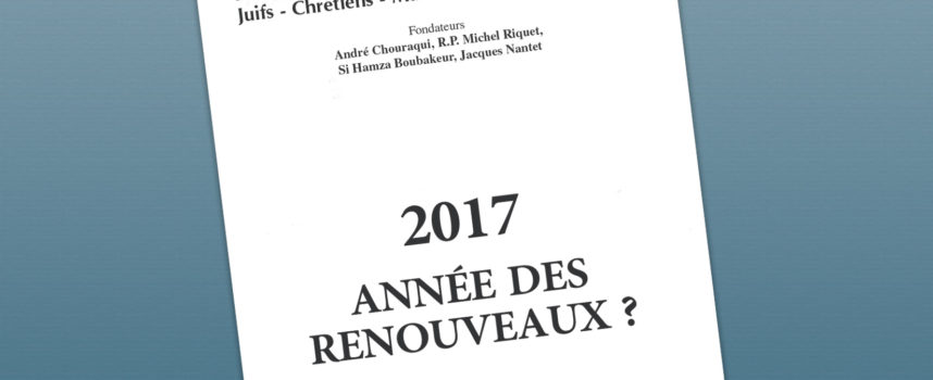 De nombreuses échéances pour 2017 : électorales, économiques, sociétales. Puissent les renouvèlements attendus se faire dans le droit fil de nos spiritualités issues d’Abraham. Le N° 172 de notre revue s’y consacre, en poursuivant la publication des conférences de notre fondation Éthique et Économie, en rendant compte du Forum Abrahamique international qui s’est tenu à Philadelphie, en décrivant les actions de nature à mieux structurer dans le cadre français l’Islam, deuxième religion de notre pays, en offrant enfin à nos lecteurs une méditation sur Abraham Père des trois religions monothéistes.